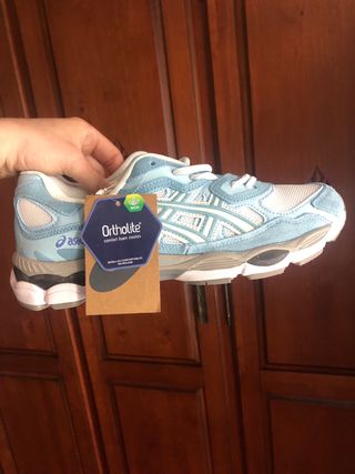 Zapatillas deportivas Asics para hombre con un diseño moderno y cómodo. - Combinación de colores beige y azul. - Detalle de malla transpirable. - Logo de Asics en el lateral. Son zapatillas ASICS Gel-NYC Harbor Blue/Wood Crepe. Su diseño se inspira en modelos de running históricos de la marca, como las GEL-NIMBUS 3 y GEL-MC PLUS V. Cuentan con la icónica tecnología GEL de ASICS para una amortiguación superior. El colorway combina tonos azul puerto y crema de madera. Son un modelo unisex lanzado en 2023.