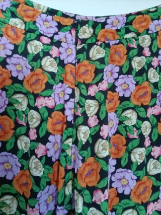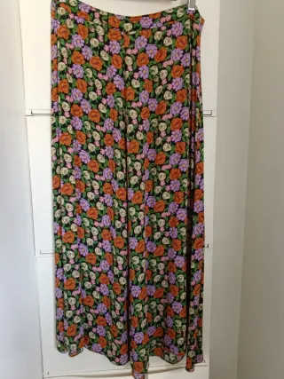 Falda larga de Mango con un estampado floral vibrante sobre fondo negro. Es una prenda fluida y cómoda. - Diseño de flores en tonos naranja, lila y blanco. - Cintura cremallera y gancho en l aparte de atrás - Corte evasé