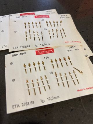 Lote de agujas para reloj de la marca Froidevaux. - Modelo: BCP 1048 - Longitud: 12,5mm - Fabricado en Suiza Una hoja 10€ Todo por 15€