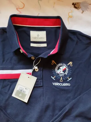 Polo de manga larga de la marca Valecuatro. - Nuevo con etiqueta. - Cuello camisero con detalle de ribete en contraste. - Raya decorativa en el pecho. - Logo bordado en la parte frontal. - Puños abotonados.