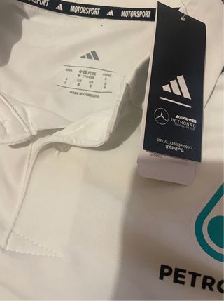 Polo oficial del equipo Mercedes-AMG Petronas de Fórmula 1. Diseño moderno y cómodo. - Color blanco con detalles en negro. - Logos de patrocinadores impresos en el pecho y mangas. - Cuello tipo polo con botones.