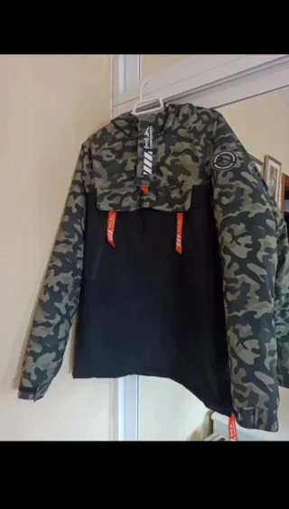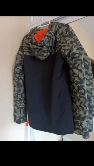 Anorak impermeable y acolchado (estilo Napapijri), de la marca deportiva TENTH. Color negro y camuflaje verde kaki. Talla 16 (XS), para chico o chica (medidas en la últimas fotos). Con capucha no extraíble. Todo el interior de forro polar color naranja. Puños con velcro para ajustar. Cremallera lateral, por lo qué queda ajustada al cuerpo. Abriga mucho y es ligera. Tres bolsillos delanteros con cremallera, cómo muestran las fotos. NUEVO sin etiqueta, porque se le quedó pequeña a mi hijo antes de usarla. Hago envíos por Wallapop envíos.