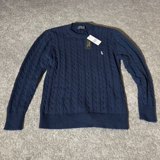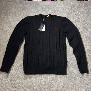 Jersey de punto trenzado Polo Ralph Lauren en color azul marino. Un clásico atemporal. Se ha usado solo 4 veces. - Diseño de punto trenzado. - Cuello redondo. - Logo del jugador de polo bordado en rojo en el pecho.