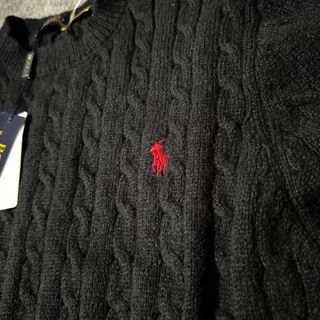 Jersey de punto trenzado en color negro de Polo Ralph Lauren. Presenta el icónico logo del caballo bordado en rojo en el pecho. - Diseño de punto trenzado. - Cuello redondo. - Manga larga. - Logo de Polo Ralph Lauren bordado.