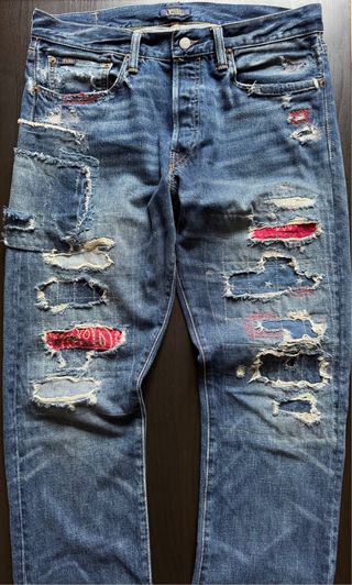 Vaqueros de estilo desgastado y con parches. Talla : 32/34. - Diseño con múltiples roturas y aplicaciones. - Detalle de parches con estampado bandana y estilo americano. - Cintura con cierre de botones.