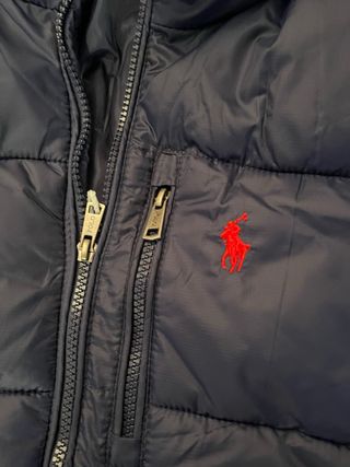 Chaqueta acolchada de Polo Ralph Lauren en color negro. Presenta un ligero desgaste en el bolsillo derecho, por lo demás perfecto. - Logo de la marca bordado en rojo en el pecho. - Cierre frontal con cremallera. - Bolsillos laterales con cremallera.