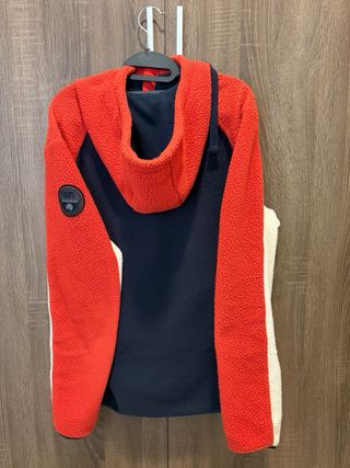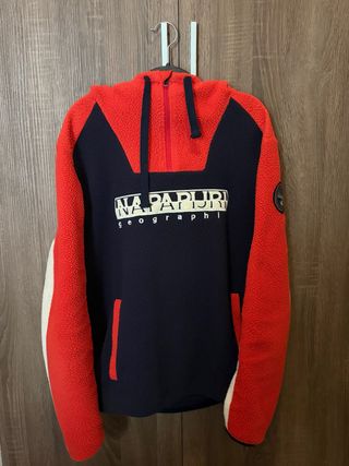 Vendo esta increíble sudadera de la marca Napapijri (modelo estilo Teide), perfecta para el invierno. Es súper cálida y cómoda. Detalles de la prenda: • Estado: Muy buen estado, cuidada. • Material: Tejido polar tipo "borreguito" (Teddy fleece) muy suave y abrigado. 100% Poliéster. • Diseño: Estilo Color Block en rojo, azul marino y mangas en tono blanco/rojo. Características: • HalfZip • Gran logotipo "Napapijri Geographic" bordado en el pecho. • Parche clásico de la marca en la manga izquierda. • Capucha ajustable con cordones. • Bolsillos laterales. 📦 Envío: Hago envíos rápidos y protejo bien el paquete