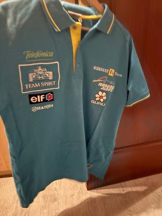 Polo de Fernando Alonso del equipo Renault. Es una prenda oficial con varios logos. - Logo de Team Spirit con un coche de F1. - Logo de Elf. - Logo de HanJin. - Logo de Telefónica. - Logo de Renault F1 Team. - Logo de Fernando Alonso con una flor. - Logo de Guru.