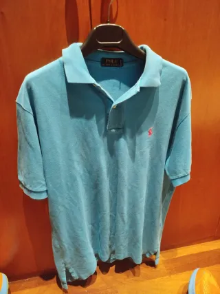 Polo de manga corta en color azul claro. - Cuello camisero. - Cierre de dos botones. - Logo bordado en el pecho. Segunda mano, marca Polo by Ralph Lauren, talla L, 100% algodón, tiene alguna mancha frontal