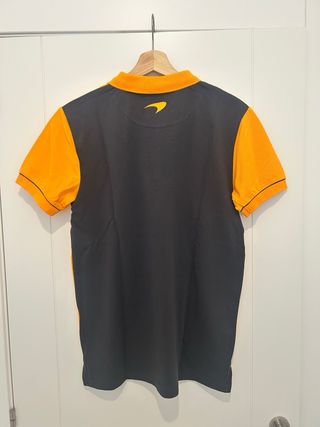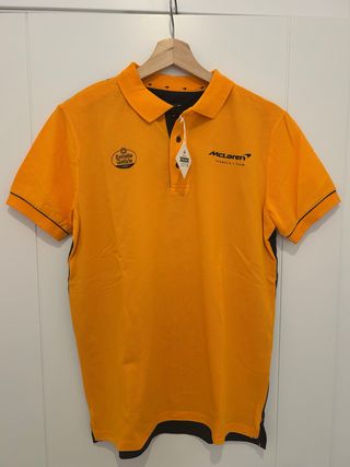 Polo oficial del equipo McLaren de Fórmula 1, con patrocinio de Estrella Galicia. - Color naranja vibrante con detalles en negro. - Logo de McLaren y Estrella Galicia bordados. - Cuello tipo polo con botones. - Tejido de algodón orgánico.