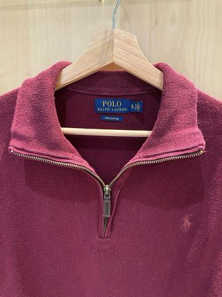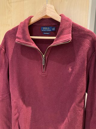 Jersey de Polo Ralph Lauren en color burdeos, talla XL. Confeccionado en algodón Pima. - Media cremallera. - Cuello alto. - Logo de caballo bordado en el pecho.