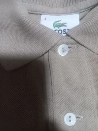 Polo de manga corta con el icónico cocodrilo de la marca. En la etiqueta pone 3 . De axil a axila mide 47 y el largo desde el hombro 65. - Cuello camisero. - Cierre de dos botones. - Logo bordado en el pecho.