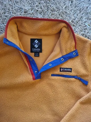 Polar de manga larga Columbia XL/TG en color amarillo con detalles en azul y rojo. Es una prenda cómoda y cálida. - Cierre de botones en el cuello. - Bolsillo frontal con cremallera.