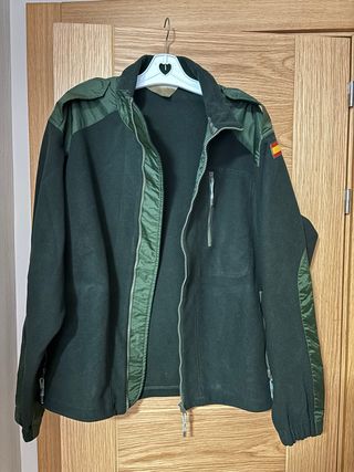 Forro polar de color verde militar, ideal para actividades al aire libre. - Diseño con refuerzos en hombros y mangas. - Bandera de España en el hombro derecho.