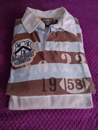 Polo marrón y azul clarito.Lleva cuello clarito y por abajo asoma cómo sí llevara una camiseta.De HM.