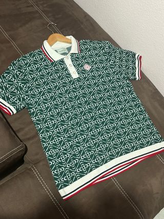 Camiseta polo de manga corta con detalles en cuello y mangas. - Logo de Prada bordado en el pecho. - Cuello tipo polo con botones. - Ribetes en contraste en cuello y mangas. - Es talla XL pero le puede quedar bien a cualquiera que use talla M, sobretodo si tiene los brazos anchos.