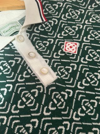 Camiseta tipo polo de la marca Casa Blanca con un diseño geométrico. - Cuello blanco con ribetes rojos y negros. - Puños de manga corta con ribetes a juego. - Bajo con banda de punto con ribetes. - Cierre de botones en el cuello.