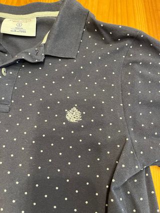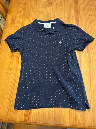 Polo de manga corta con un diseño de lunares blancos sobre fondo azul marino. - Cuello tipo polo. - Cierre de dos botones. - Pequeño escudo bordado en el pecho.