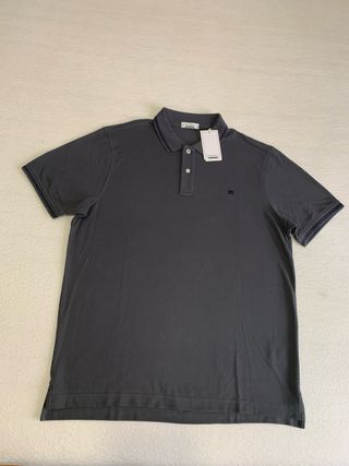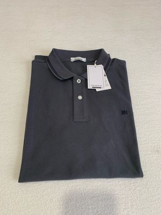 Polo de manga corta de la marca Pedro del Hierro en color gris oscuro, talla L. Presenta un diseño clásico y elegante. Nuevo, sin estrenar, con etiquetas. - Cuello con detalle de rayas. - Cierre de dos botones. - Logo bordado en el pecho.