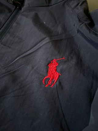 Chaqueta deportiva de la marca Polo Ralph Lauren en color azul. Presenta un diseño clásico con cierre de cremallera. - Logo de Polo Ralph Lauren bordado en el pecho. - Escudo decorativo en la parte frontal izquierda. - Puños y cintura elásticos. - Bolsillo en el cuello que en su interior guarda la capucha.