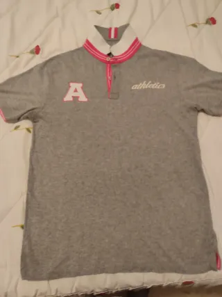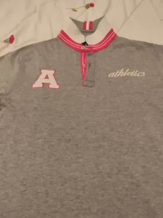 Polo de manga corta en color gris, con un diseño deportivo y detalles en rosa. - Cuello tipo polo con ribetes. - Logo A en el pecho. - Inscripción athletics bordada. - Poco uso, en impecable estado.