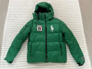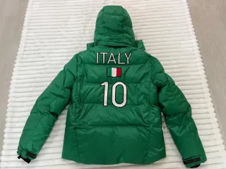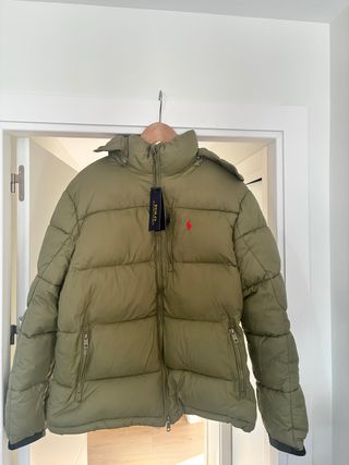 Título: Plumífero Polo Ralph Lauren - Edición Italia "Big Pony" - Talla M Descripción: Pieza de coleccionista. Plumífero Ralph Lauren original de la codiciada serie "Country Pack" (Italia). Color verde vibrante con detalles bordados de alta calidad. • Frontal: Logo Big Pony blanco y parche oficial "ITA 10". • Espalda: Bordado espectacular "ITALY 10" con bandera tricolor. • Estado: 9/10. Plumas con mucho "puff", sin pérdida de volumen. • Extras: Capucha desmontable original incluida, cierres de puño ajustables, bolsillos interiores de seguridad y forro térmico en el cuello.