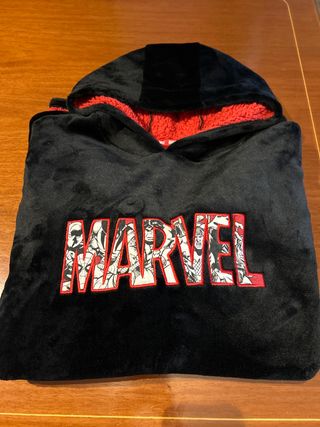 Sudadera polar con capucha y letras MARVEL. - Exterior de color negro y bolsillo central muy gustoso. - Interior de forro polar, estilo corderillo rojo. - Estampado de personajes de Marvel en las letras.