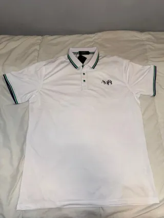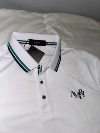 Polo de manga corta de la marca Amiri. Presenta un diseño clásico con cuello y detalles en las mangas. - Cuello con ribete a rayas verdes y azul marino. - Logo de Amiri bordado en el pecho. - Botones a presión en la parte delantera.