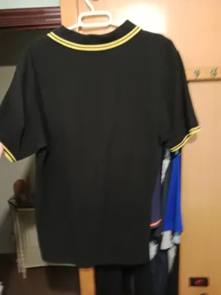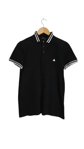Polo de manga corta en color negro con un discreto logo bordado en dorado en el pecho. - Aunque en la etiqueta ponga talla XL equivale a una M - Usado una vez - Cuello clásico. - Cierre de dos botones. - Tejido de algodón.