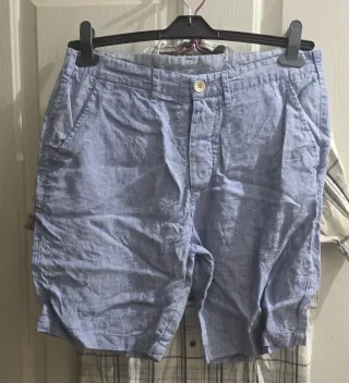Pantalones cortos de lino para hombre.camiseta talla L , polo talla xxl ,camisa talla S, la unidad 1 euro - Tejido ligero y transpirable. - Cintura con trabillas para cinturón. - Cierre de botón y cremallera. - Bolsillos laterales.