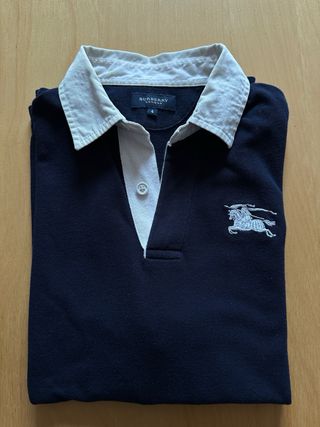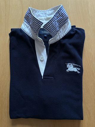 Precioso Polo de manga corta de la marca de alta costura Burberry. - Cuello blanco con detalle de rayas azules. - Logo de Burberry bordado en el pecho. - Cierre de botones en la parte delantera. Solo se ha usado una ocasión para el bautizo de la foto.
