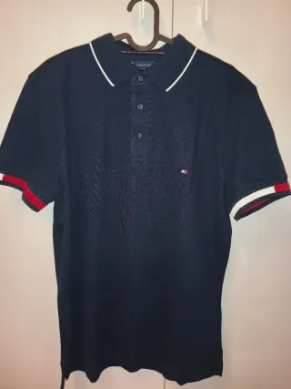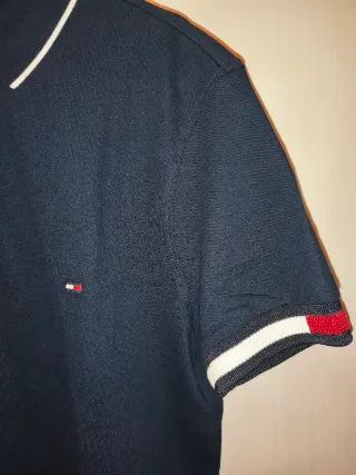 Polo de manga corta de la marca Tommy Hilfiger, Nuevo con etiquetas. Cuello con botones y ribeteado en blanco, así como ribetes rojo y blanco en las mangas con logo de la marca en el pecho.