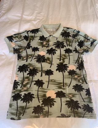 Camiseta tipo polo con un diseño veraniego de palmeras y atardecer. - Estampado de palmeras en tonos verdes y rosados. - Cuello tipo polo con botones. - Manga corta. - Estado perfecto
