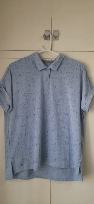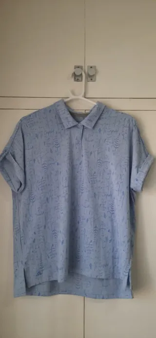 Polo de manga corta con un estampado botánico en tonos azules. Cuello camisero y cierre de botón. - Diseño con estampado de hojas y ramas. - Mangas cortas con vuelta. - Bajo con aberturas laterales.