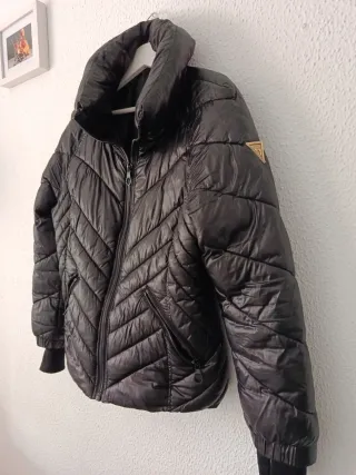 Abrigo acolchado de la marca Guess. - Diseño moderno con cuello alto. - Cierre de cremallera frontal. - Bolsillos laterales con cremallera y polar por dentro. - Detalle de logo triangular en la manga. - Poco uso - Abriga mucho