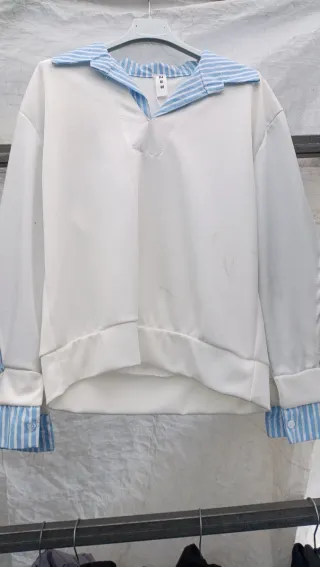Camiseta de manga larga para mujer con un diseño moderno y juvenil. - Cuello estilo polo con detalle de rayas. - Puños de las mangas con estampado de rayas. - Tejido blanco liso.