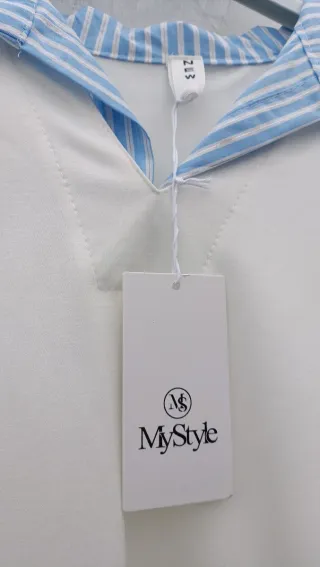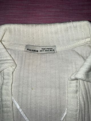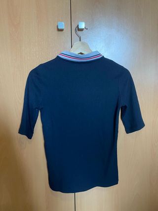 Polo de Stradivarius de corte ceñido, estilo colegiala. - Cuello tipo polo con detalles de rayas rojas y blancas. - Cremallera frontal con tirador metálico. - Manga 3/4. - Tejido acanalado.