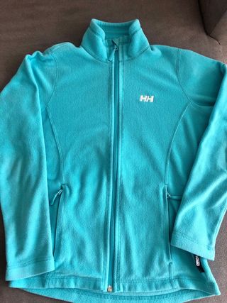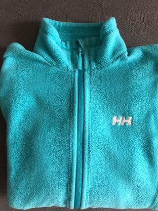 Precioso Forro polar ligero original de la marca Helly Hansen, comprado en Noruega. - Cremallera completa. - Cuello alto. - Color azul claro precioso. - Talla XS o 36 de mujer. - Logo de la marca en el pecho y cremallera, y letras grandes en parte trasera del cuello. - Bolsillos laterales. Excelente calidad. Usado, pero en muy buen estado. Se hacen envíos rápidos y perfectamente empaquetados.