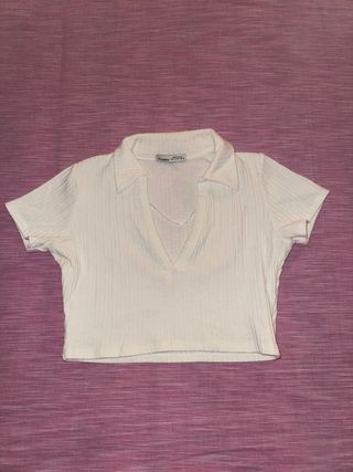 Polo blanco de canalé con cuello. - Manga corta. - Diseño cropped.