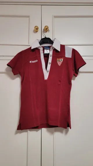 Polo de manga corta para mujer del Sevilla FC. - Diseño deportivo con cuello blanco. - Escudo del equipo en el pecho. - Logo de Joma bordado. Aunque pone talla L talla pequeño, es una M