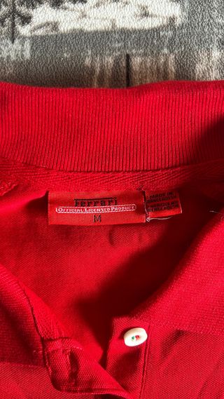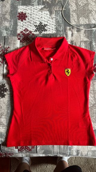 Camiseta tipo polo de la marca Ferrari para mujer. Presenta el icónico escudo de la marca en el pecho. - Original y sin estrenar - Diseño de manga corta. - Cuello tipo polo con botones. - Escudo de Ferrari bordado.