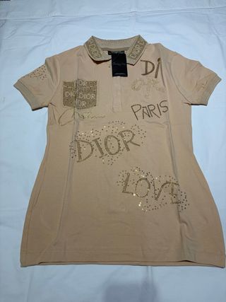 Polo de la marca Dior en color beige. Un diseño elegante y llamativo. - Detalle de pedrería y bordados. - Cuello tipo polo. - Manga corta. -da poca talla