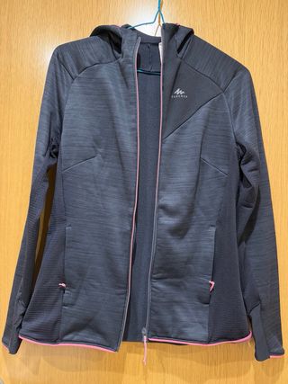 Polar con capucha de la marca Quechua. - Cierre completo con cremallera. - Dos bolsillos laterales con cremallera. - Logo de la marca bordado en el pecho. - Pequeño bolsillo extra en una manga, ideal para llaves o monedas. - Es una talla M entalladita