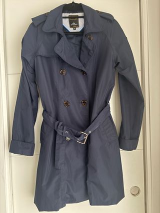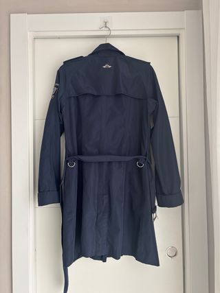 Gabardina de la marca HV Polo Society en color azul, talla M pero sirve L Un clásico que nunca pasa de moda. - Diseño de doble botonadura. - Cinturón ajustable a la cintura. - Cuello con solapas. - Puños enrollados.