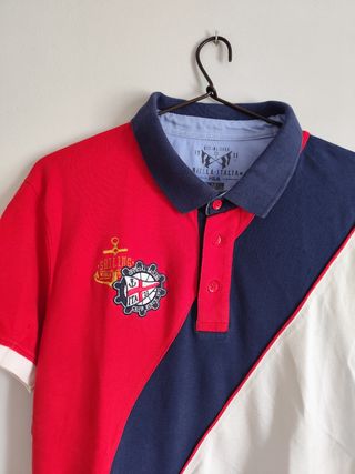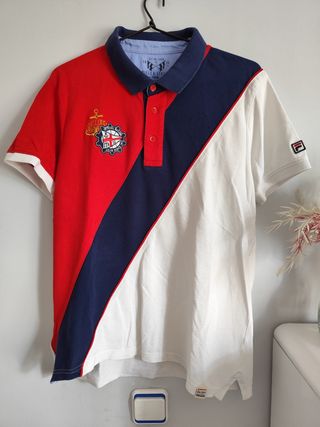 Polo de manga corta con un diseño moderno y deportivo. - Combinación de colores rojo, azul marino y blanco. - Cuello tipo polo con botones. - Logo de Fila en la manga. - Parche con diseño náutico en el pecho.