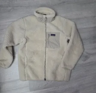Chaqueta de forro polar de Patagonia en tonos beige y blanco hielo. Perfecta para el frío. Talla L. Esta usada en unas cuantas ocasiones y tiene una pequeñita calva que apenas se aprecia por eso el precio más bajo. - Cierre completo con cremallera. - Bolsillo en el pecho con cremallera. - Cuello alto.