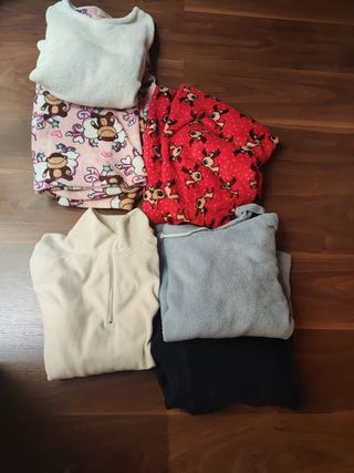 pijama Primark talla m. compuesto por pantalón de monos y parte de arriba blanca. poco uso. 5€ . pantalón rojo de navidad de renos. sin estrenar. talla m. Primark. peluso. 5€ polar fino color beige tiene una pequeña manchita. talla l. 4€. polar azul cielo. com capucha. algo usado. talla m. 3€ pantalones polares zara talla 16 años. 155-150 cm. con gomas ajustables en la parte de la cintura y los tobillos. 5€