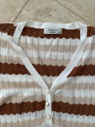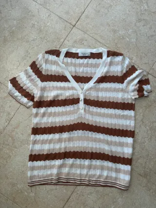 Camiseta tipo polo de la marca Woman El Corte Inglés. Presenta un diseño de rayas horizontales con un patrón zig-zag. - Cuello en V con botones. - Manga corta. - Tejido de punto calado.
