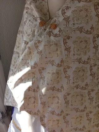 Elegante manta con un diseño de brocado en tonos dorado/bronce y blancos, ideal para trajes regionales o eventos especiales. - Tejido con patrón floral y ornamental. - Cierre con dos botones dorados. - Aporta un toque de distinción. -forrada con tela polar lo que es ideal para los días de frio