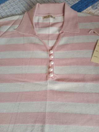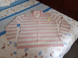 Jersey lana señora. Talla XL/XXL Listas horizontales color rosa palo y plateado. Cuello tipo polo Sin estrenar.